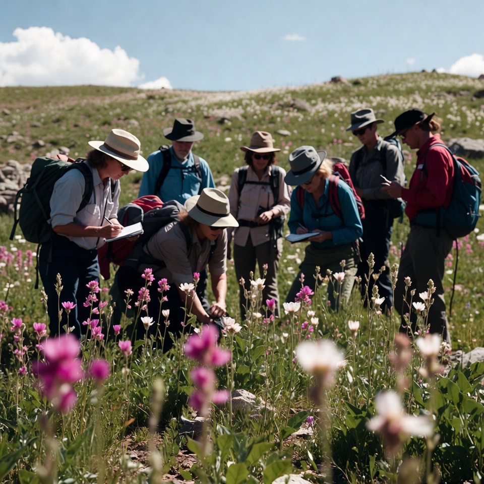 Group examining wildflowers on mountain meadow