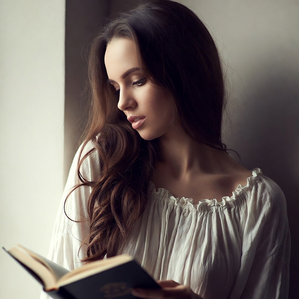 A young woman with long wavy brown hair reads an open book while standing by a large window. She wears a white off-shoulder blouse with ruffled neckline and gazes thoughtfully at the pages. Soft natural light illuminates her profile against a plain gray wall.
