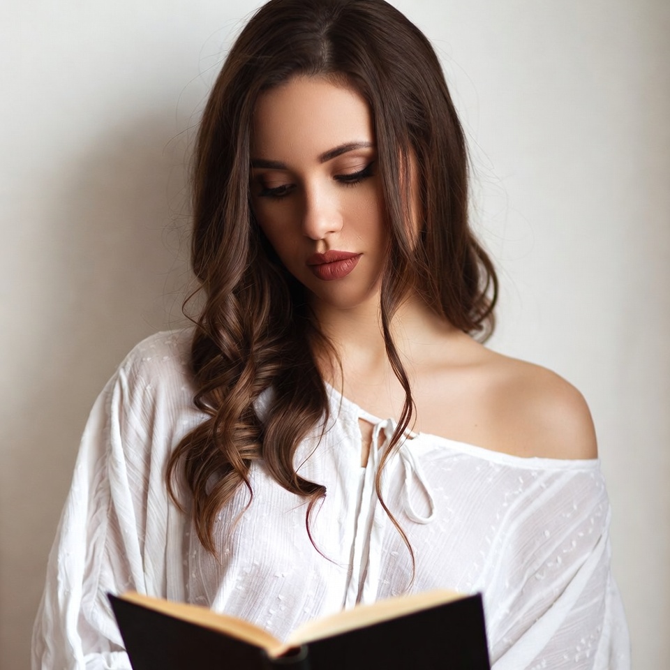 A young woman with long wavy brown hair reads an open black book while standing against a plain white background. She wears an off-shoulder white blouse with lace details and has subtle makeup with red lips. Her expression is focused as she holds the book close to her chest.