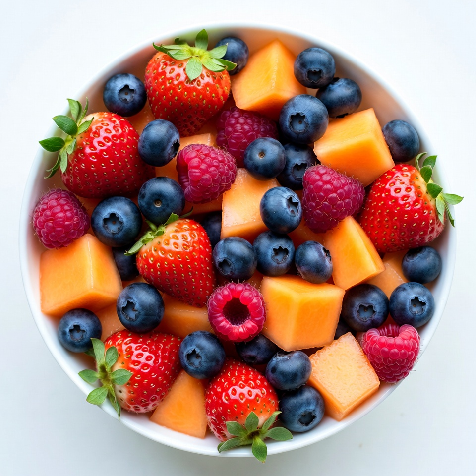 berries, blue blueberries, blueberries, cantaloupe, delicious fruit, fresh fruit, fruit salad, healthy food, isolated background, juicy berries, mixed fruit, orange melon, raspberries, red strawberries, strawberries, summer fruit, top view, vibrant colors, white bowl, fruit bowl