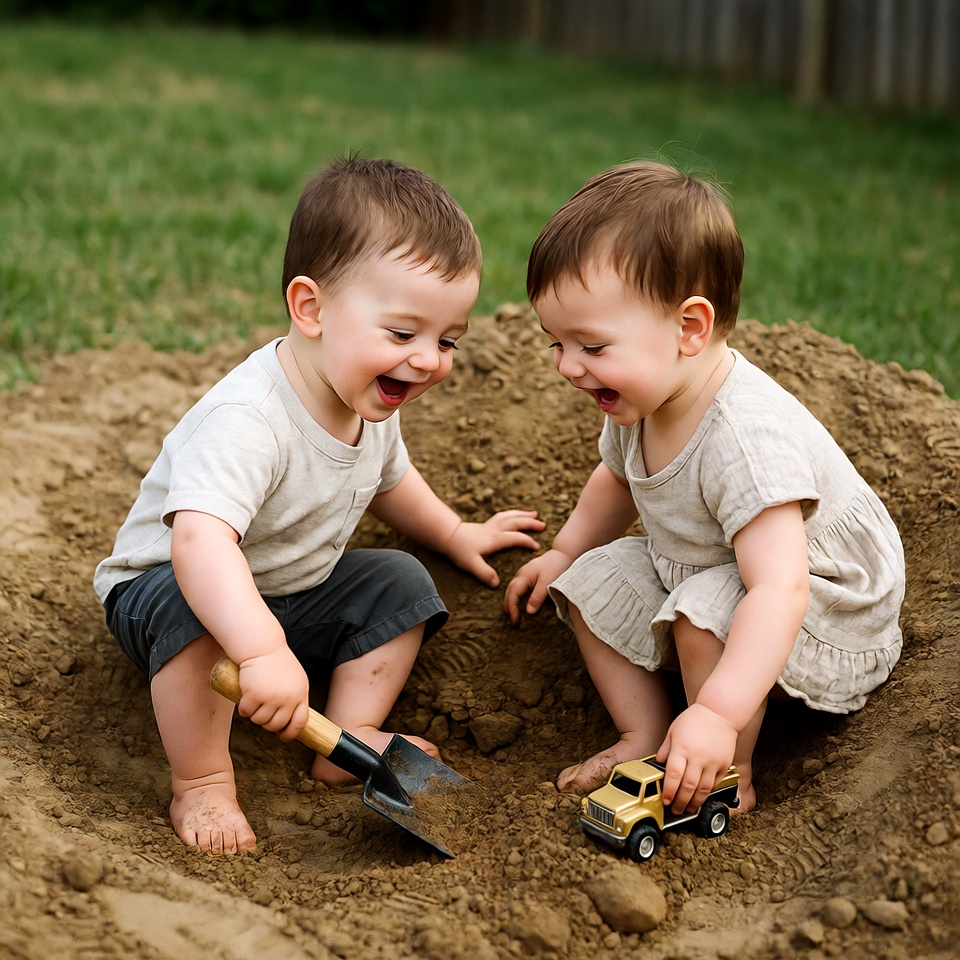 Two young White toddlers, a boy and a girl, sit in a backyard sandpit laughing happily. The boy holds a black shovel and wears a light shirt with gray shorts, while the girl holds a yellow toy truck and wears a light dress. They play together on green grass with a wooden fence in the background.
