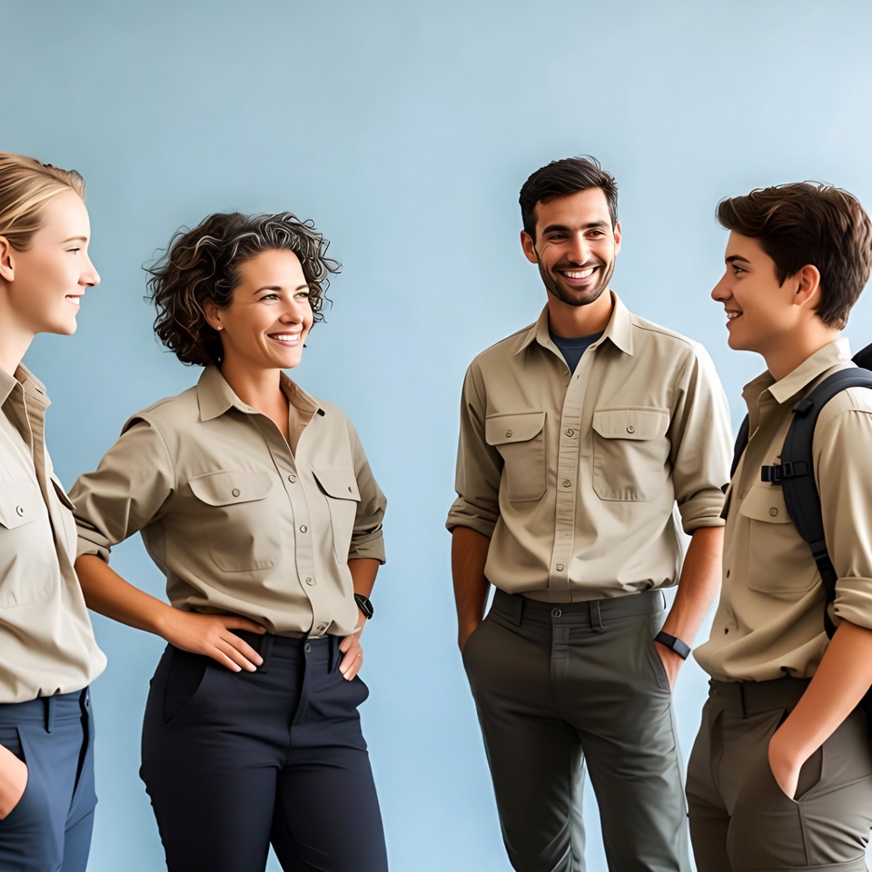Four people, two women and two men, stand smiling on a solid blue background. They wear matching khaki shirts and pants, with the young man wearing a backpack. One woman has straight blonde hair, another curly dark hair, and the men have short dark hair.