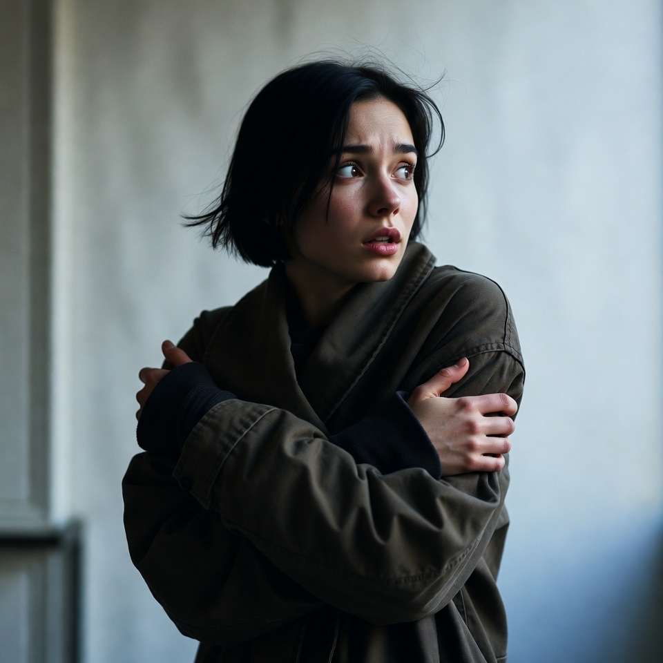 Asian, arms crossed, brown coat, cold pose, female, indoor, khaki jacket, open mouth, plain background, portrait, shivering, short black hair, surprised expression, tense posture, wide eyes, windswept hair, young woman, woman
