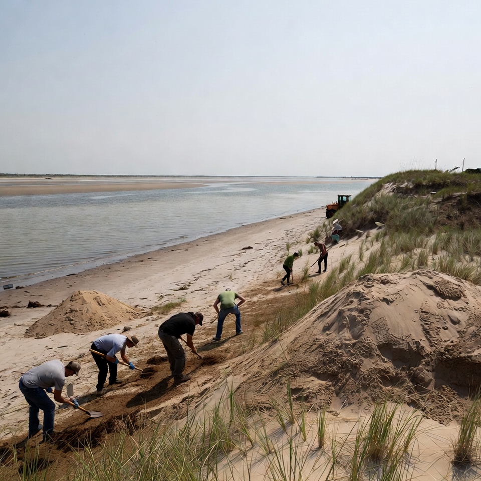 Several workers in casual clothing are shoveling sand and digging on a sandy beach near dunes and tall grass. A yellow tractor is parked nearby on the shore, with a calm river or estuary visible in the background under a clear sky. They work along piles of sand at the edge of the water.