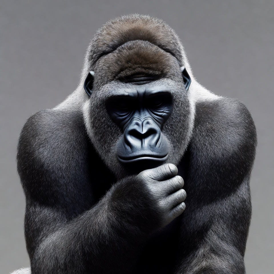 animal, ape, black fur, close-up, dark fur, furry animal, gray background, hand on chin, intense gaze, mammal, portrait, primate, realistic rendering, serious expression, silverback, strong gorilla, thoughtful gorilla, wild animal, wildlife, gorilla