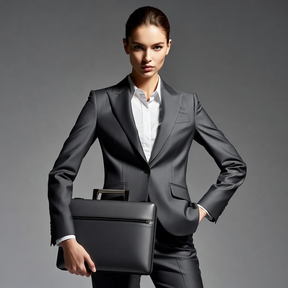 A young woman with dark hair in a sleek bun stands confidently in a gray suit jacket, white shirt, and matching pants. She holds a black leather briefcase in her right hand and places her left hand on her hip. The image features a plain gray background.