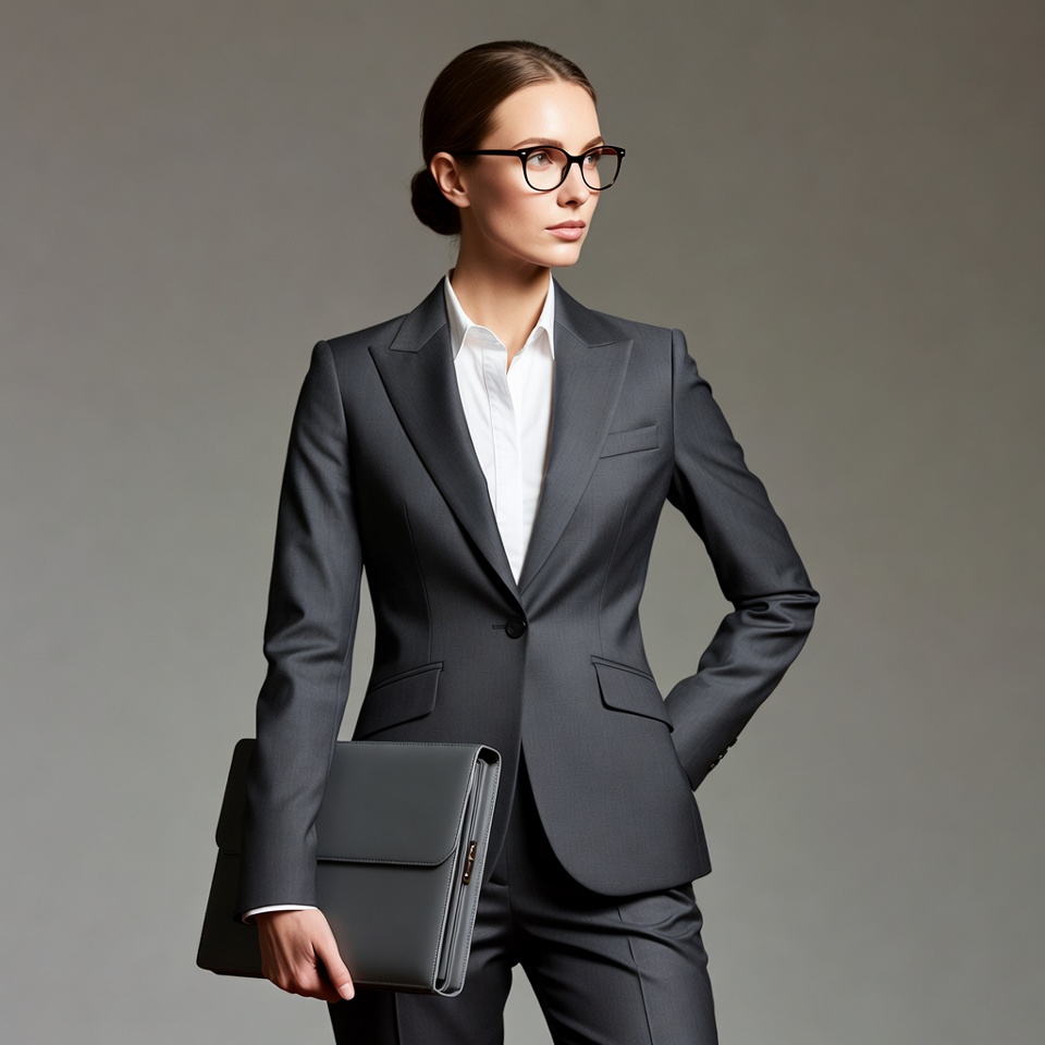 A young woman with brunette hair in a sleek bun wears glasses and a fitted gray suit jacket over a white collared shirt. She stands confidently with one hand on her hip, holding a gray leather briefcase in the other. The image features a plain gray background.