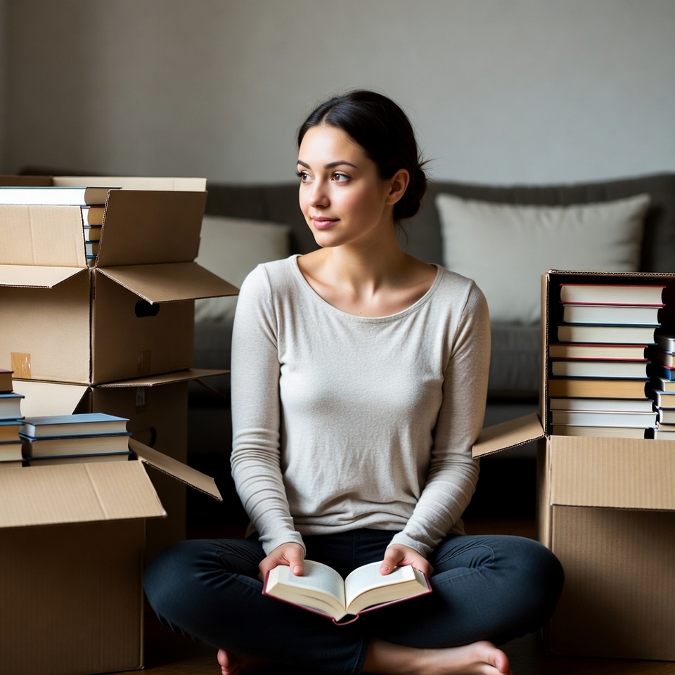 A young woman with dark hair in a bun sits cross-legged on the floor, reading an open book. She wears a light beige long-sleeve top and dark pants, surrounded by stacked cardboard boxes and piles of books. The setting appears to be a living room with a gray couch in the background.