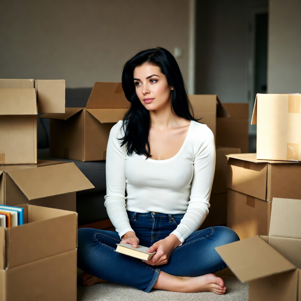A woman with long black hair sits on the floor holding an open book. She wears a white scoop-neck top and blue jeans, barefoot with legs crossed. She is surrounded by numerous cardboard moving boxes in a beige room.