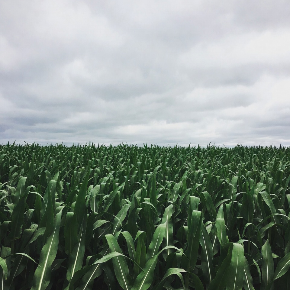 A vast field of tall green corn plants stretches across the landscape under a cloudy gray sky. The corn stalks feature broad leaves and are densely packed in rows. The scene captures the expansive agricultural field with no people or structures visible.