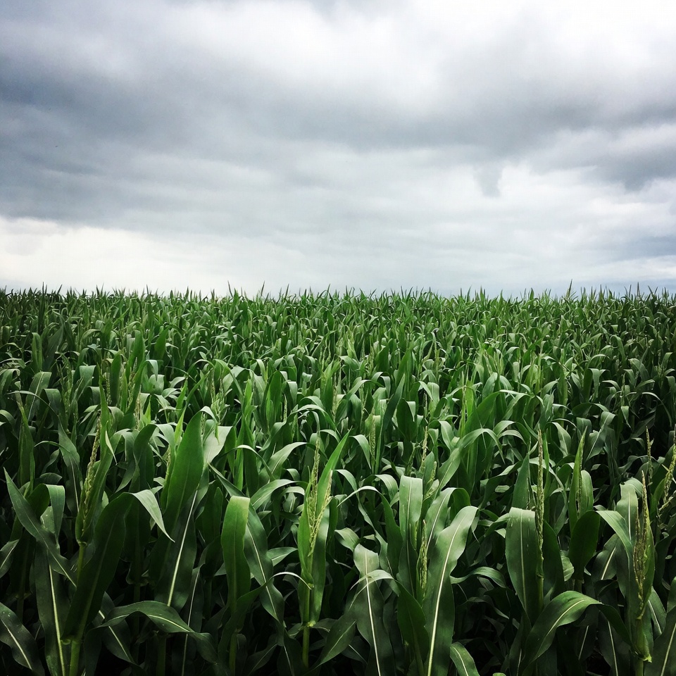 agriculture, cloudy sky, corn leaves, corn plants, corn stalks, corn tassels, cornfield, crop, crops, farm, farmland, field, gray clouds, green corn, maize field, nature, outdoors, overcast, plants, rural landscape, stormy sky, corn field