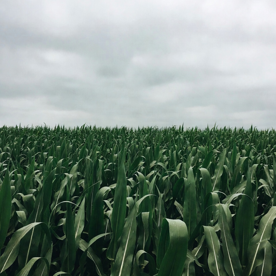 A vast field of tall green corn stalks stretches across the landscape under a gray cloudy sky. The corn plants feature broad leaves and dense rows. The horizon divides the green field from the overcast sky.
