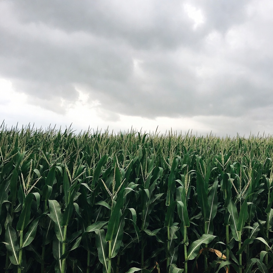 agriculture, cloudy sky, corn crop, corn leaves, corn plants, corn stalks, crops, farm field, farmland, field landscape, gray clouds, green corn, green field, maize, overcast sky, rural field, sky background, tall corn, tassels, corn field