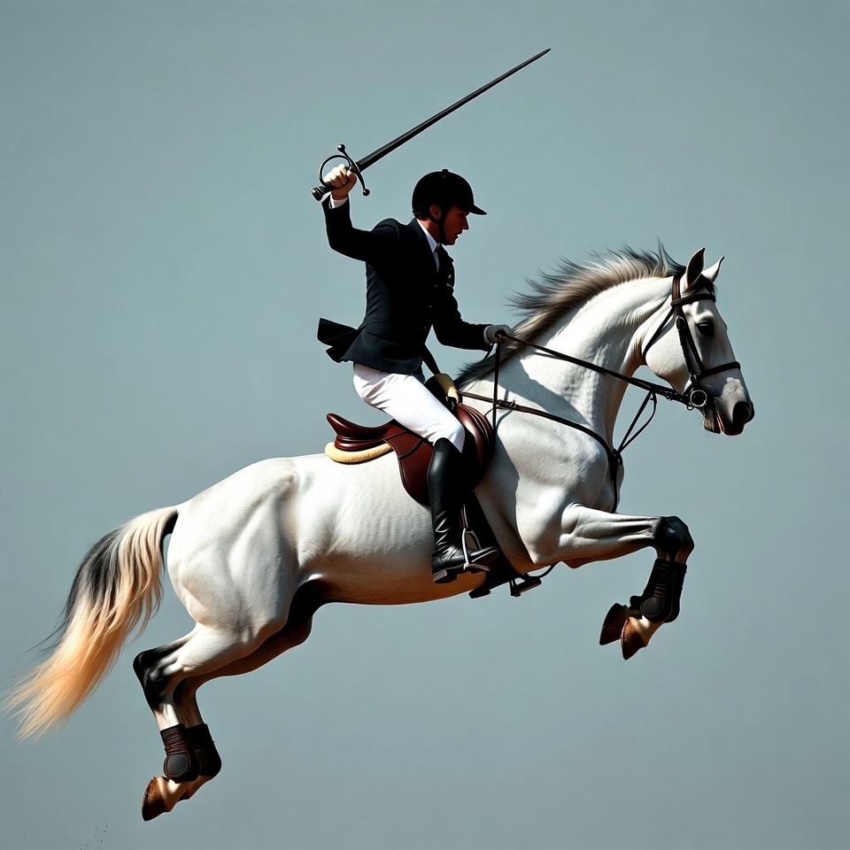 A man in black equestrian uniform and helmet rides a white horse leaping in mid-air against a blue sky. He holds a sword raised high in his right hand while gripping the reins with his left. The horse has a flowing mane and tail, with black boots on its legs.