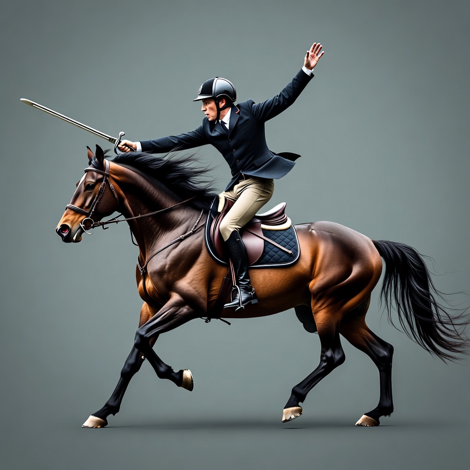 A man in equestrian riding attire and helmet rides a brown horse on a gray background. He holds a sword in his right hand raised high and extends his left arm. The horse gallops dynamically with flowing mane and tail.