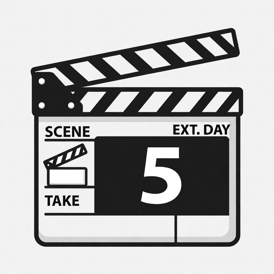 black and white, cinema, clapboard, clipart, ext day, film clapper, film production, hollywood, illustration, isolated background, line art, movie clapperboard, scene 5, take 5, clapperboard