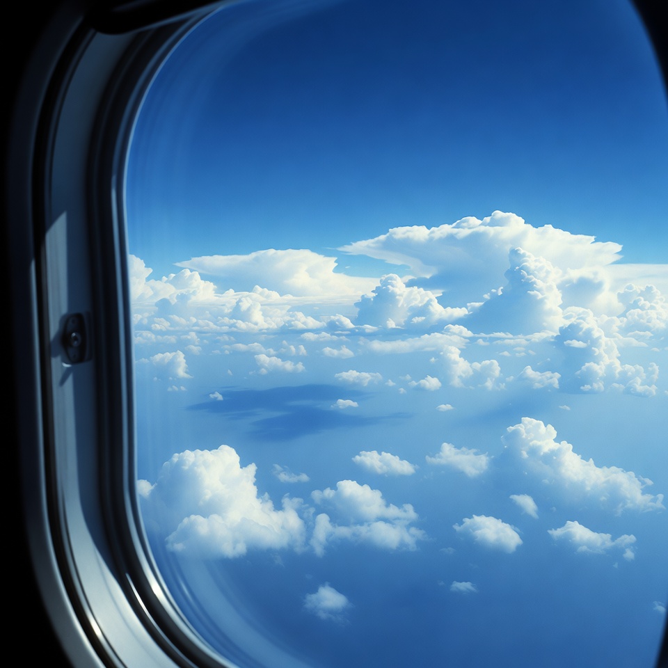 aerial view, aircraft window, airplane view, aviation, blue sky, clear sky, clouds, cumulus clouds, fluffy clouds, flying, sky view, white clouds, window seat, airplane window