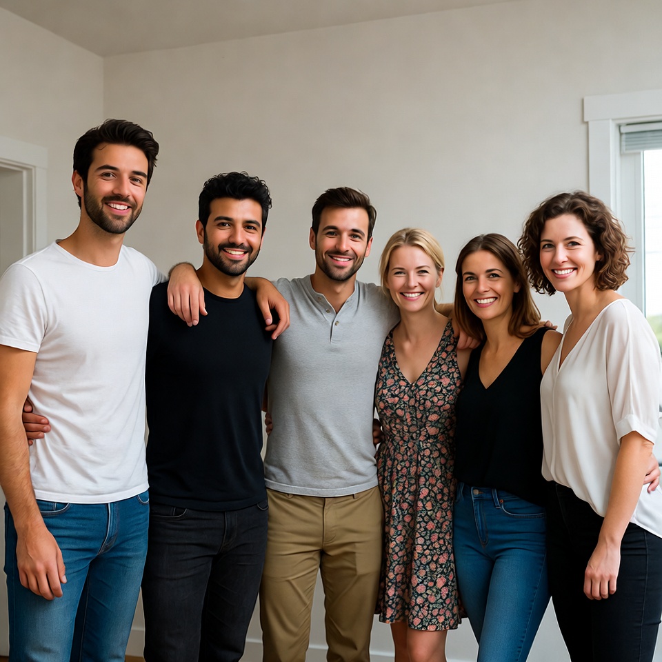 Six diverse friends, including four men and two women, stand closely together in a bright empty room with white walls and large windows. The men wear casual t-shirts, button-up shirts, and jeans, while the women wear floral dresses, black tops, and white blouses. They smile happily with arms around each other.