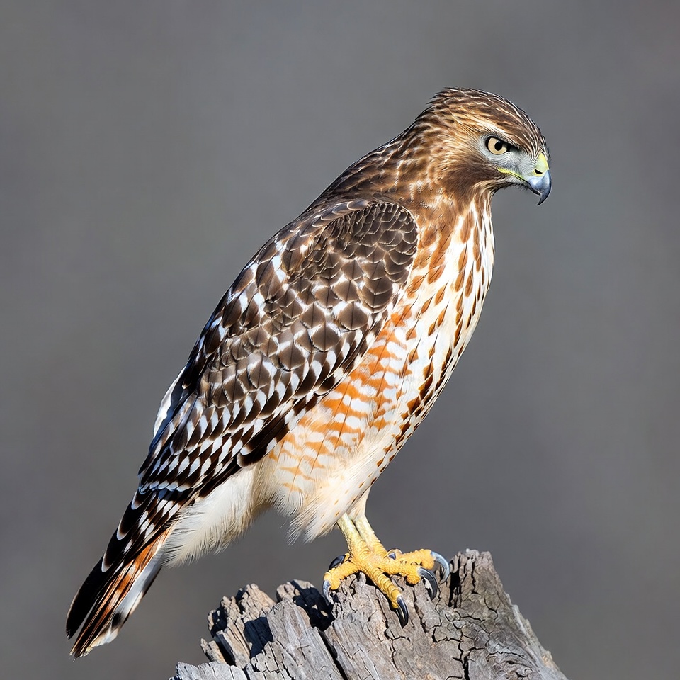 A red-tailed hawk stands alert on a mossy tree stump against a gray background. Its feathers display intricate brown, white, and orange patterns with a distinctive reddish tail. The bird's sharp yellow beak and piercing eyes face forward.