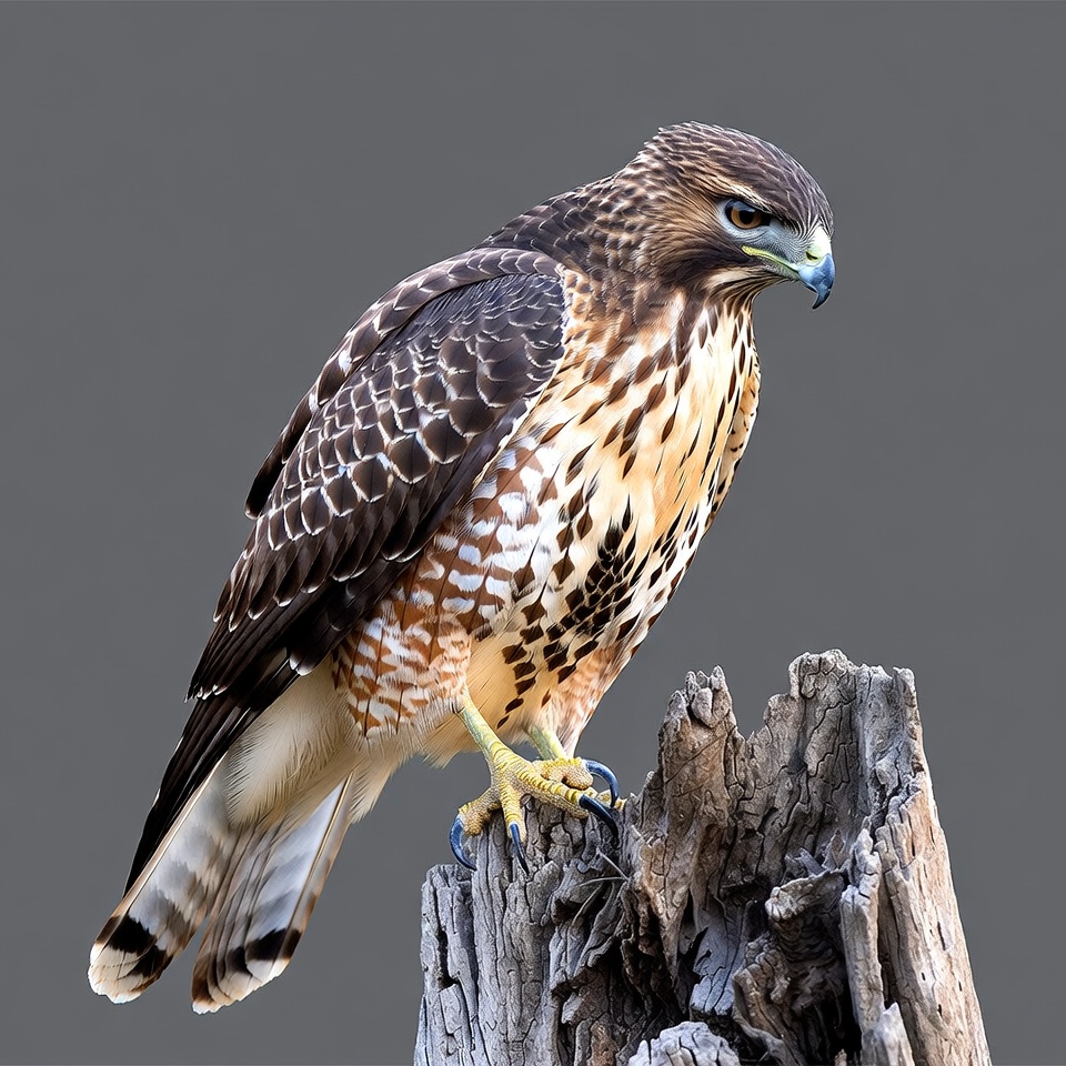 A red-tailed hawk with intricate brown, white, and orange feathers perches on a weathered tree stump. Its sharp yellow beak and talons grip the wood firmly, while its piercing eyes gaze forward. The bird stands against a plain gray background.