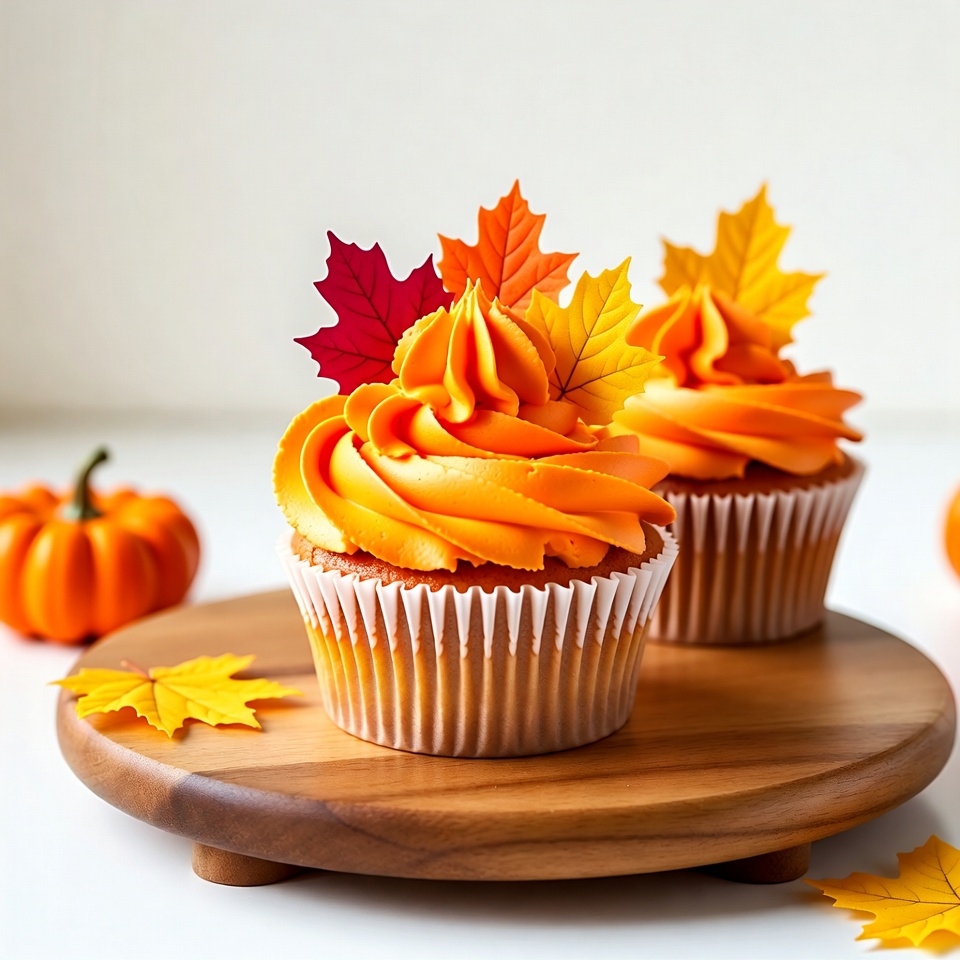 autumn leaves, fall dessert, frosting swirls, holiday treats, leaf decoration, maple leaves, mini pumpkins, orange cupcakes, orange frosting, pumpkins, red leaves, thanksgiving cupcakes, white background, wooden board, cupcakes