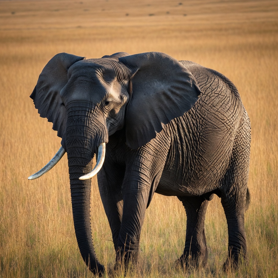 A large African elephant with long tusks stands in a golden grassy savanna. Its ears are spread wide, and trunk hangs down as it walks forward. The background features dry grasslands under a clear sky.