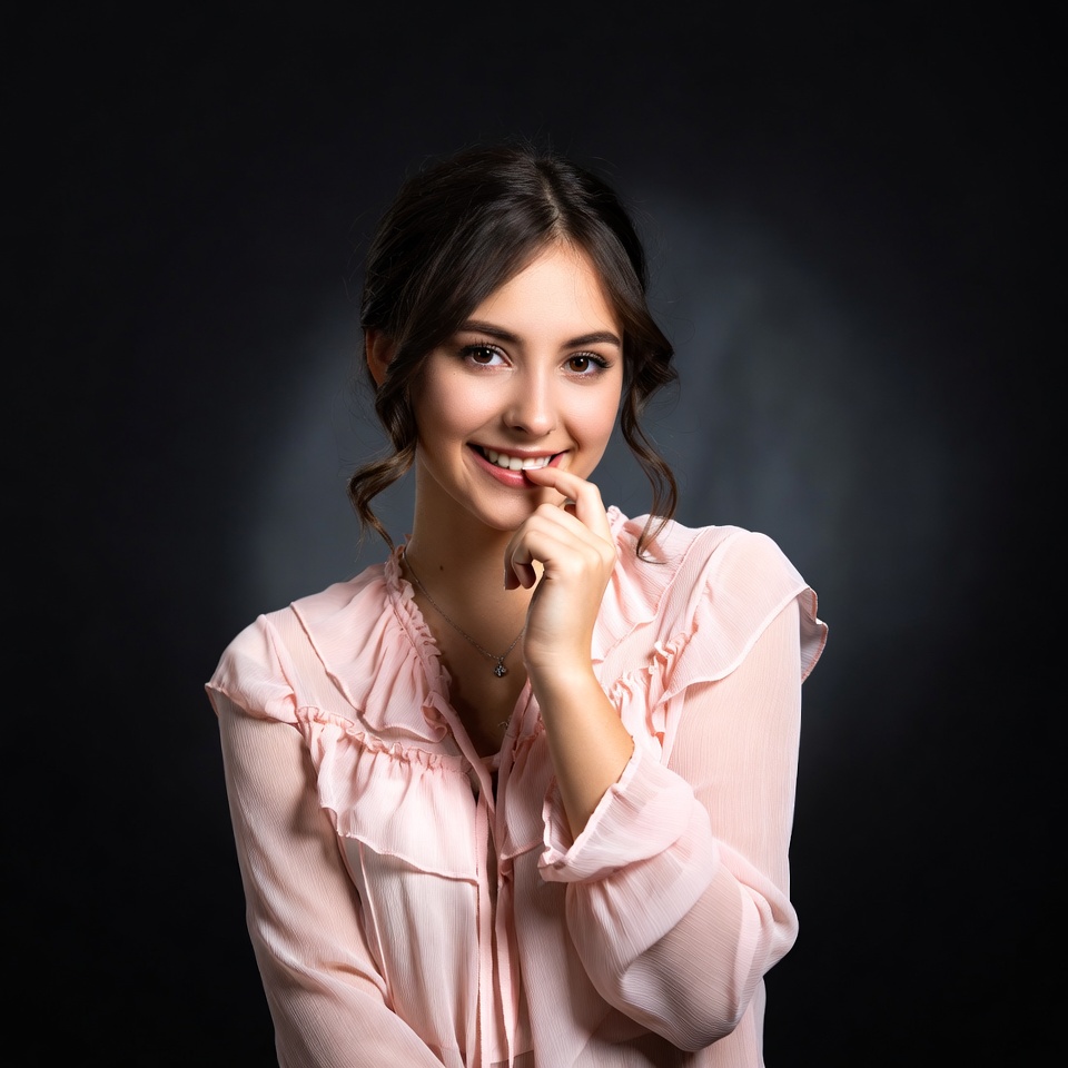 brown hair, coy smile, dark background, dark hair, female, finger on lips, headshot, loose hair, necklace, pink blouse, playful expression, portrait, ruffled shirt, sheer top, smiling, studio portrait, young woman, woman