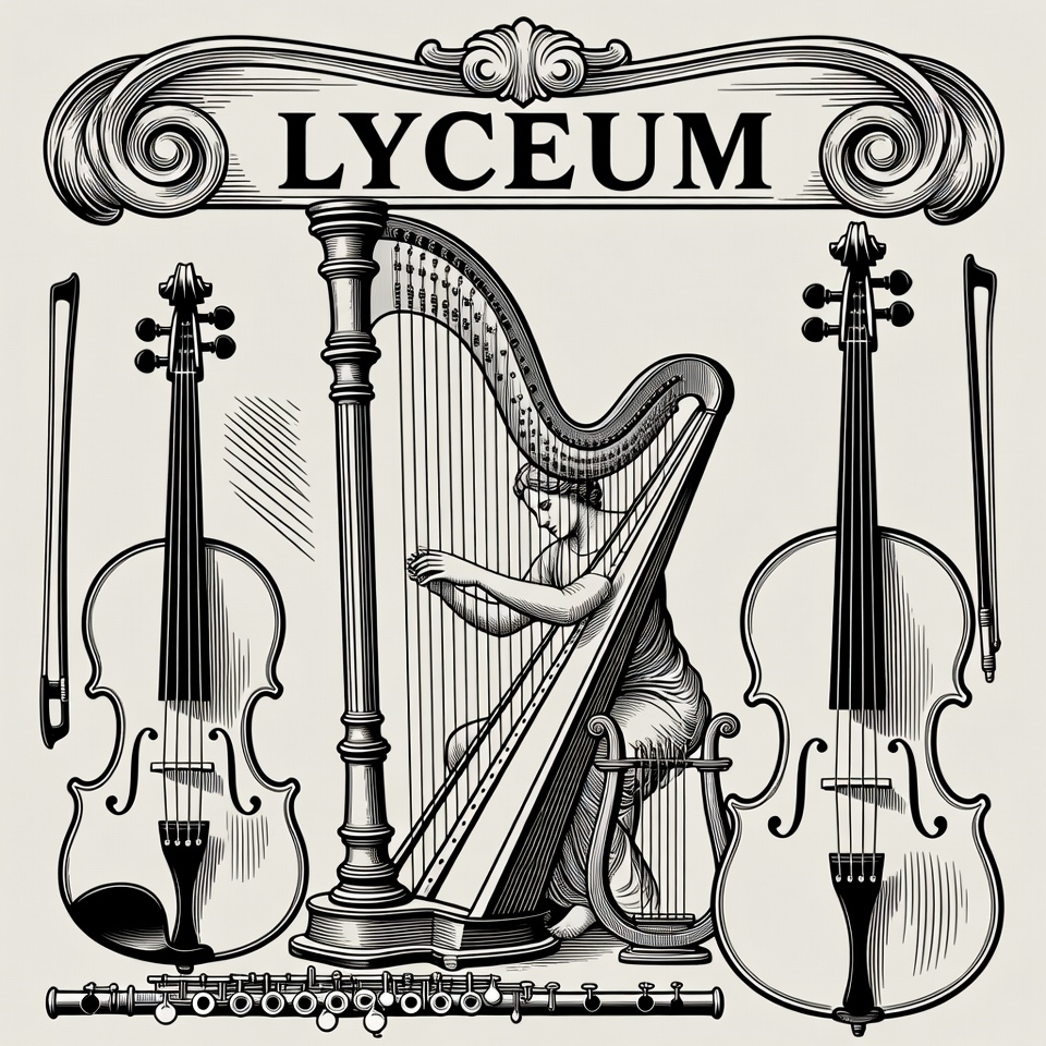 A black and white line art illustration features a woman seated and playing a large harp. Flanking the harp are two violins and a flute at the bottom. Ornate lettering spelling 'LYCEUM' arches above the musical instruments.