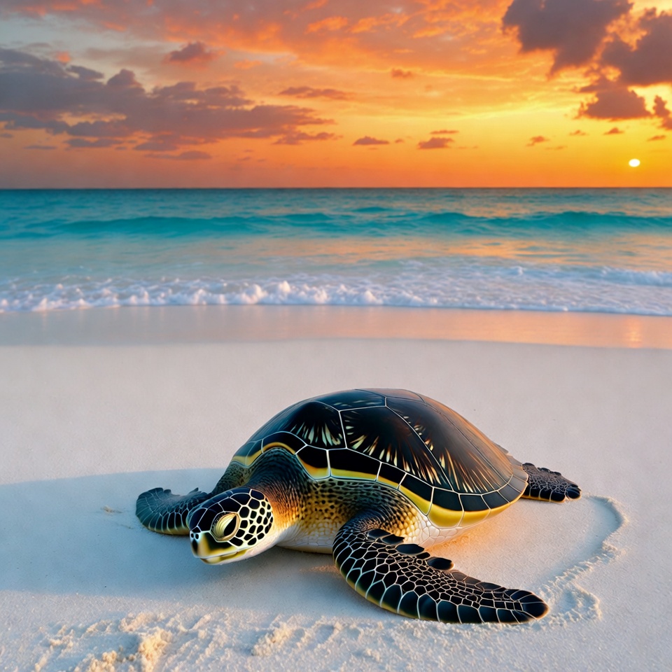 Sea Turtle on Beach at Sunset