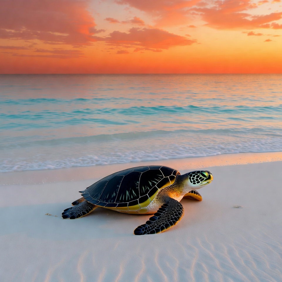 animal, beach, crawling turtle, flippers, green turtle, marine animal, nature, ocean, orange sky, pink clouds, sand, seashore, sunset, tropical beach, turquoise water, turtle, waves, white sand, wildlife, sea turtle