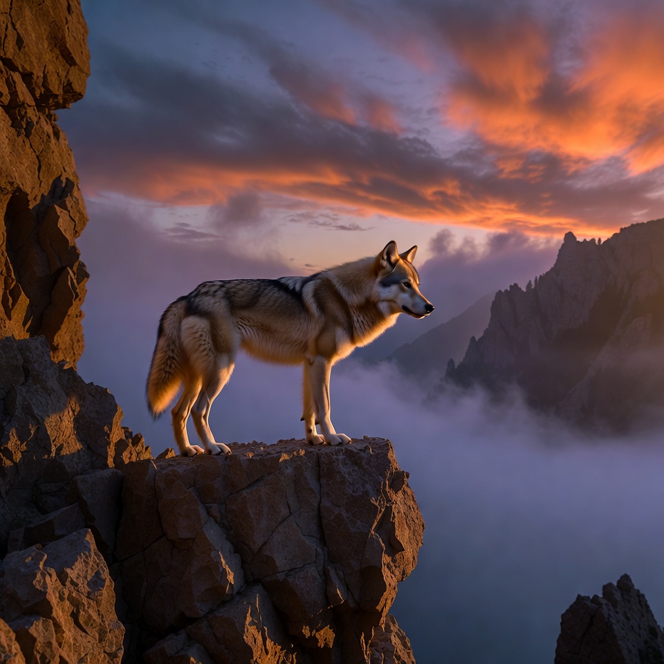 A husky dog with gray and white fur stands on a rocky cliff edge overlooking misty mountains. Vibrant sunset clouds in orange and purple hues illuminate the rugged peaks and deep valley below. The dog gazes forward with alert ears and tail raised.