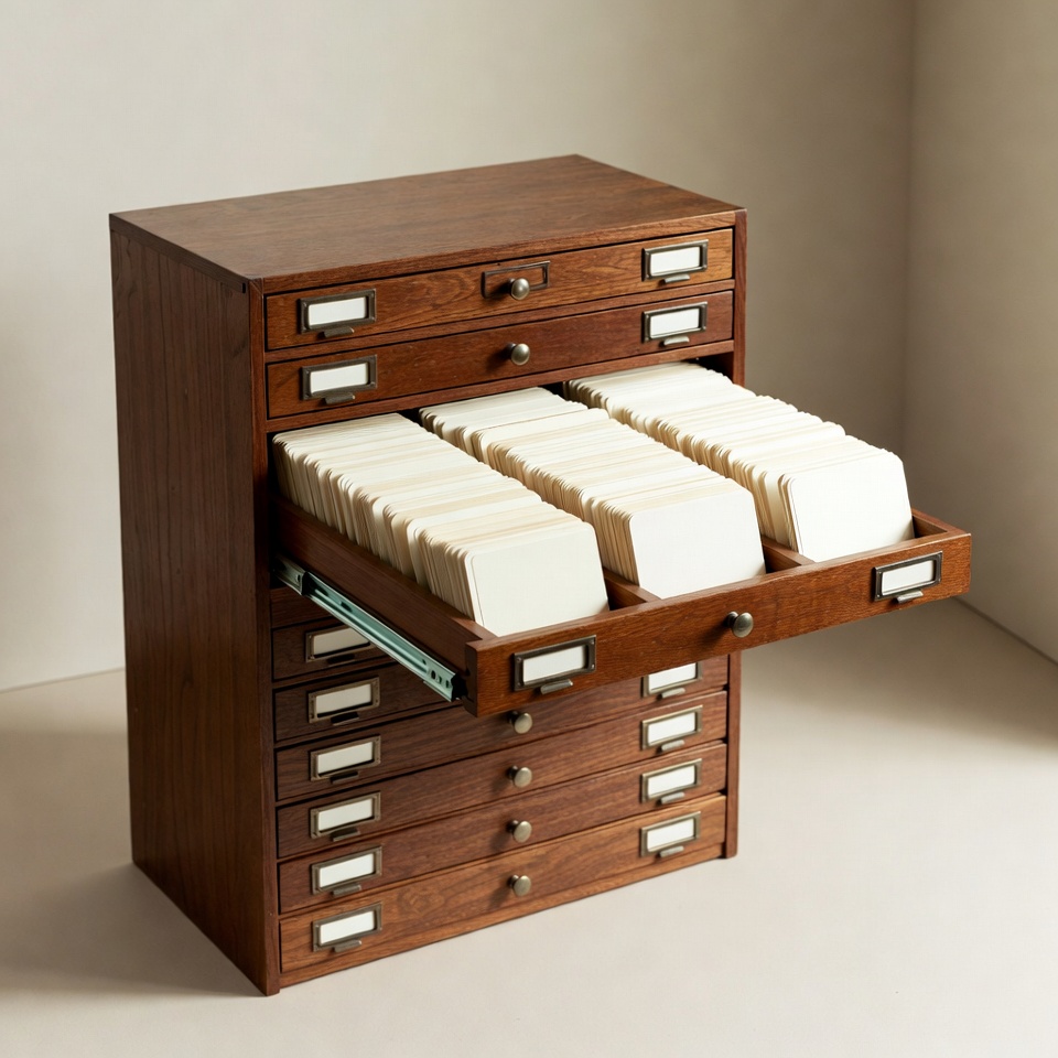 A tall wooden card catalog cabinet with multiple drawers stands against a light wall. The middle drawer is pulled out, revealing rows of white index cards neatly organized inside. Brass drawer pulls and labels add detail to the vintage-style furniture.