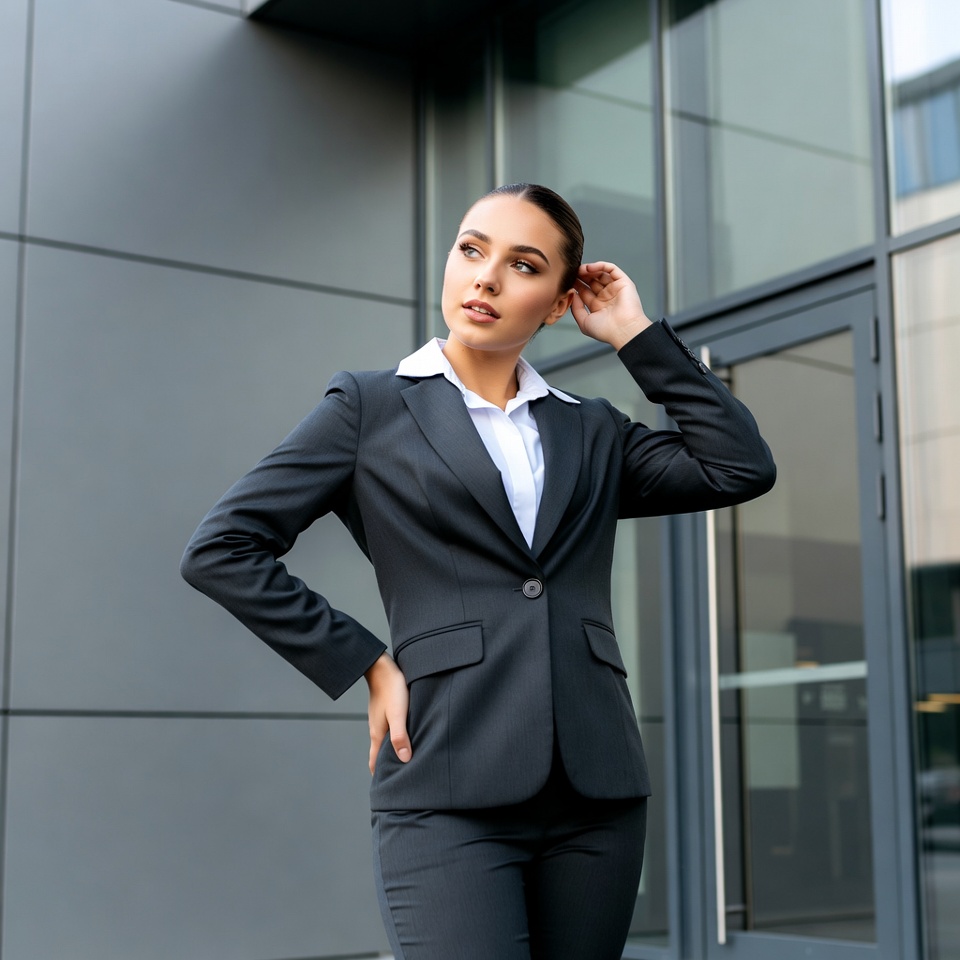 A young woman in a black business suit stands in front of a modern gray building with glass doors. She touches her ear with one hand while placing the other on her hip, wearing a white collared shirt under the suit jacket and pants. Her hair is styled in a neat bun.