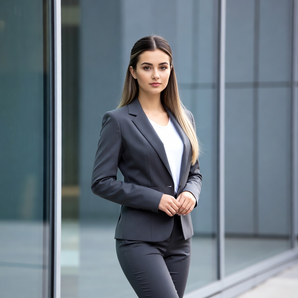 A young woman with long straight hair stands confidently in front of a modern glass building. She wears a tailored gray blazer, white blouse, and matching gray pants, with her hands clasped in front. The background features reflective glass panels on a gray facade.