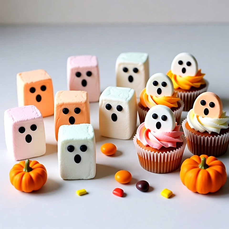 Assortment of white, pink, and orange ghost-shaped marshmallows with black dot eyes arranged on a white surface. Colorful Halloween cupcakes topped with ghost icing and orange pumpkins sit nearby. Scattered candy corn and orange candies add festive details.
