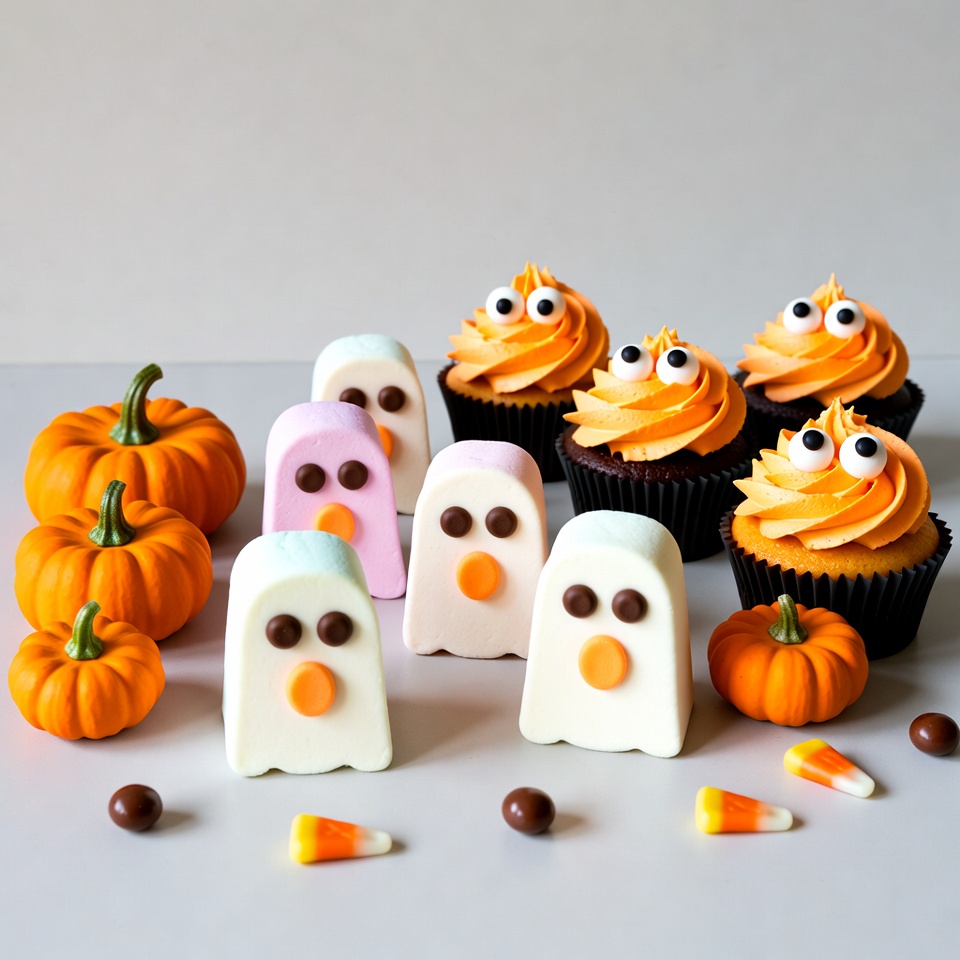 A collection of Halloween-themed ghost cupcakes with orange frosting and googly eyes sits on a white surface. White marshmallow ghosts with black dot faces are arranged nearby. Small pumpkins, candy corn, and chocolate candies are scattered around the treats.