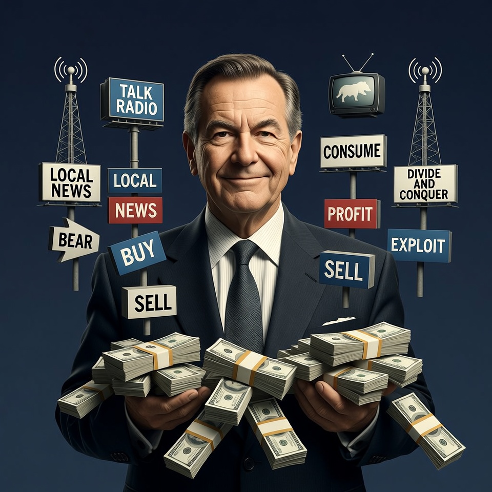 An older man in a dark suit and tie stands smiling while holding stacks of U.S. dollar bills in his hands. Behind him on a dark background are various signs with words like 'TALK RADIO', 'LOCAL NEWS', 'BUY', 'SELL', 'PROFIT', 'EXPLOIT', 'DIVIDE', 'CONQUER', and media icons including TV and radio towers. The image has a graphic illustration style with bold text and symbols.