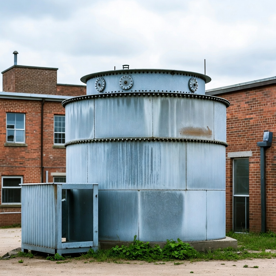 A large cylindrical blue water tank with rust shows multiple bolted flanges on its upper section. It stands outdoors next to brick industrial buildings under a cloudy sky. A small metal shed adjoins the base of the tank amid sparse grass.