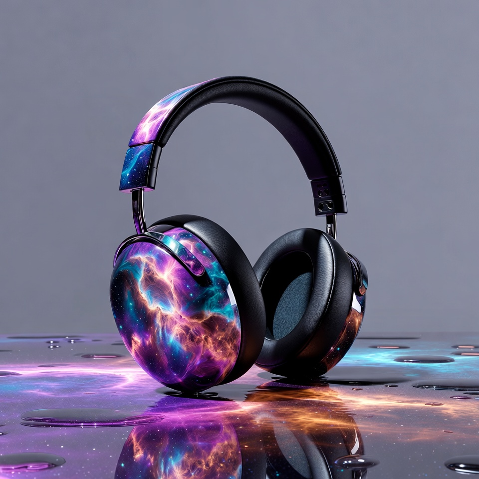 audio gear, black headphones, cosmic design, futuristic headphones, galaxy design, galaxy print, music headphones, nebula pattern, neon galaxy, over-ear headphones, product photo, purple headphones, purple nebula, reflective surface, space theme, starry headphones, wet background, wireless headphones, headphones
