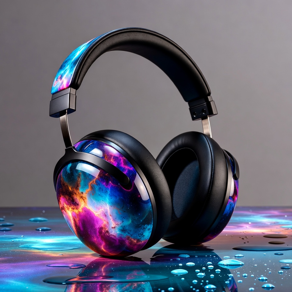 audio gear, black headphones, blue nebula, futuristic headphones, galaxy design, glowing reflections, headphones on table, nebula pattern, neon galaxy, over-ear headphones, product photography, purple galaxy, reflective surface, space headphones, water droplets, wet surface, wireless headphones, headphones