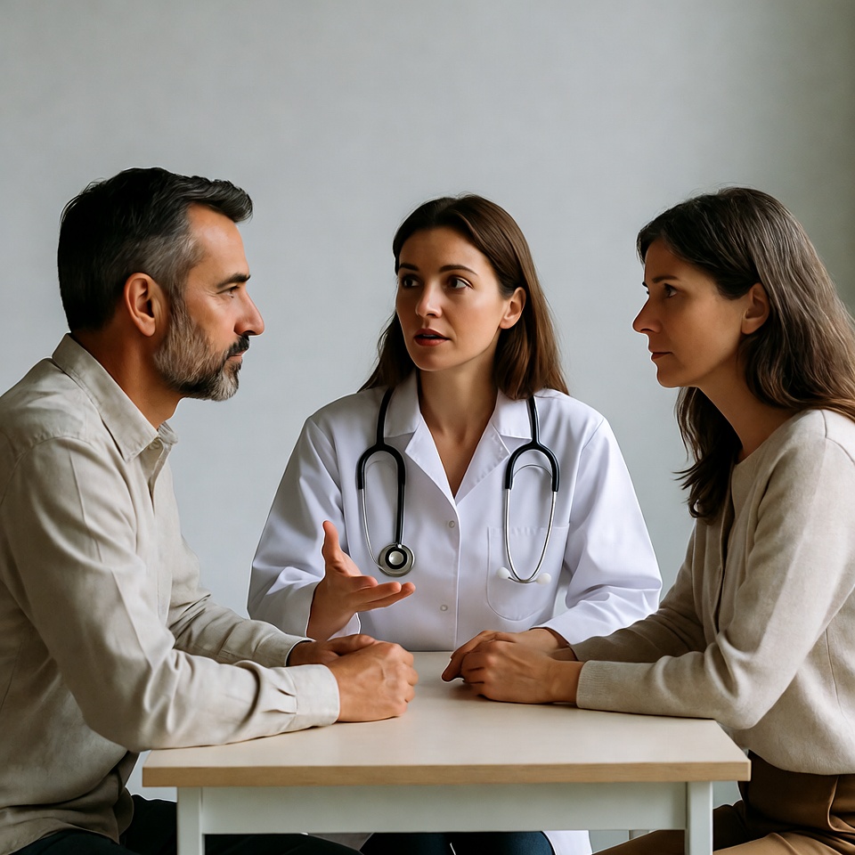 A female doctor in a white coat and stethoscope sits at a table, speaking and gesturing with her hands during a consultation. A man with gray hair and beard in a beige shirt and a woman with long brown hair in a cream sweater sit attentively listening across from her. The scene takes place in a plain indoor setting with a light wooden table.