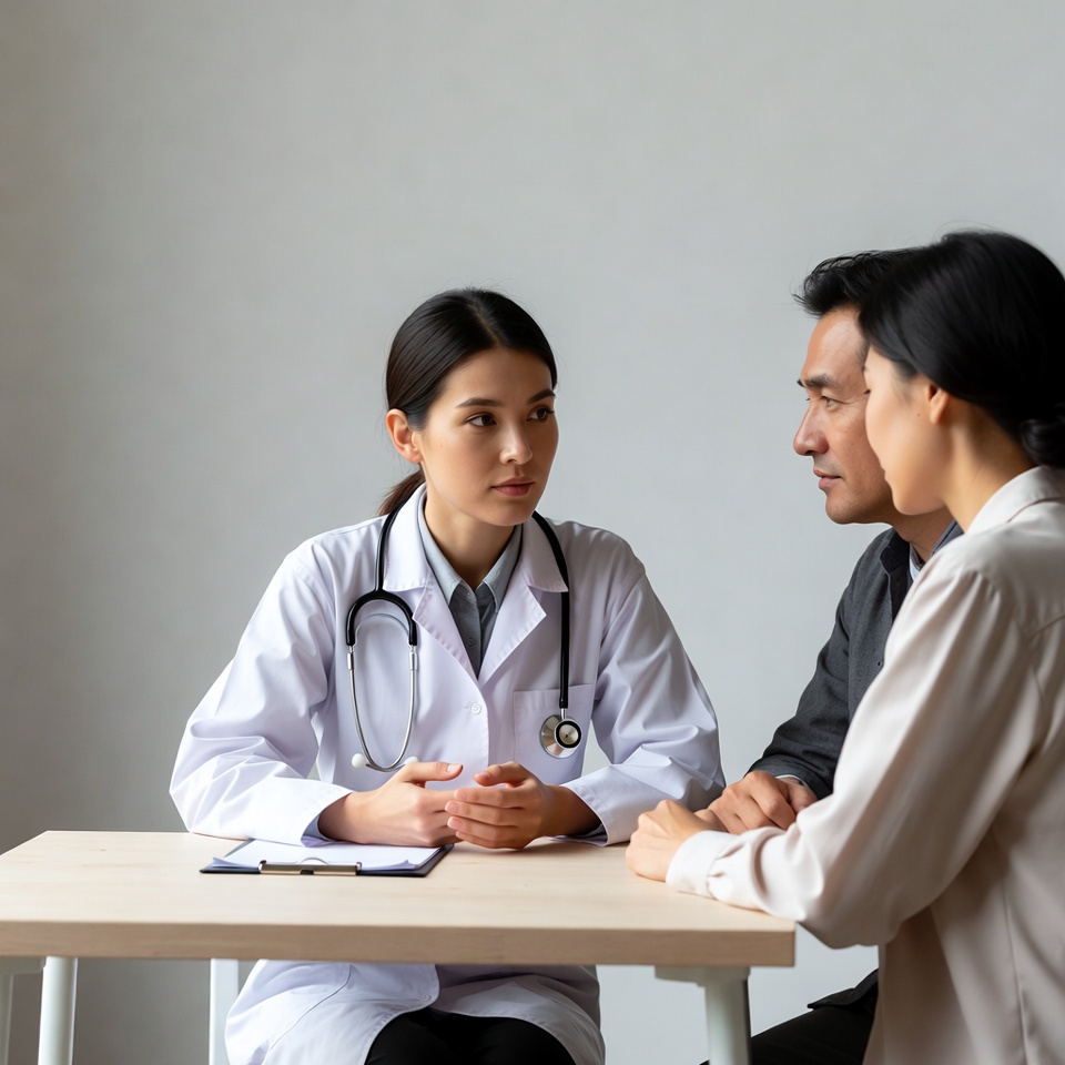 A female Asian doctor in a white lab coat and stethoscope sits at a table consulting an Asian couple. The man wears a dark suit and the woman a light blouse, both seated attentively across from her. They are engaged in discussion in a plain clinical room with a clipboard on the table.