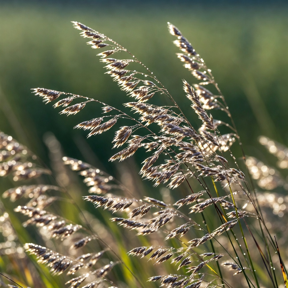 Tall grass blades with feathery seed heads sway gently in the breeze against a blurred green field background. Sunlight highlights the delicate tips, creating a shimmering effect. The image captures intricate details of the grass in natural outdoor lighting.