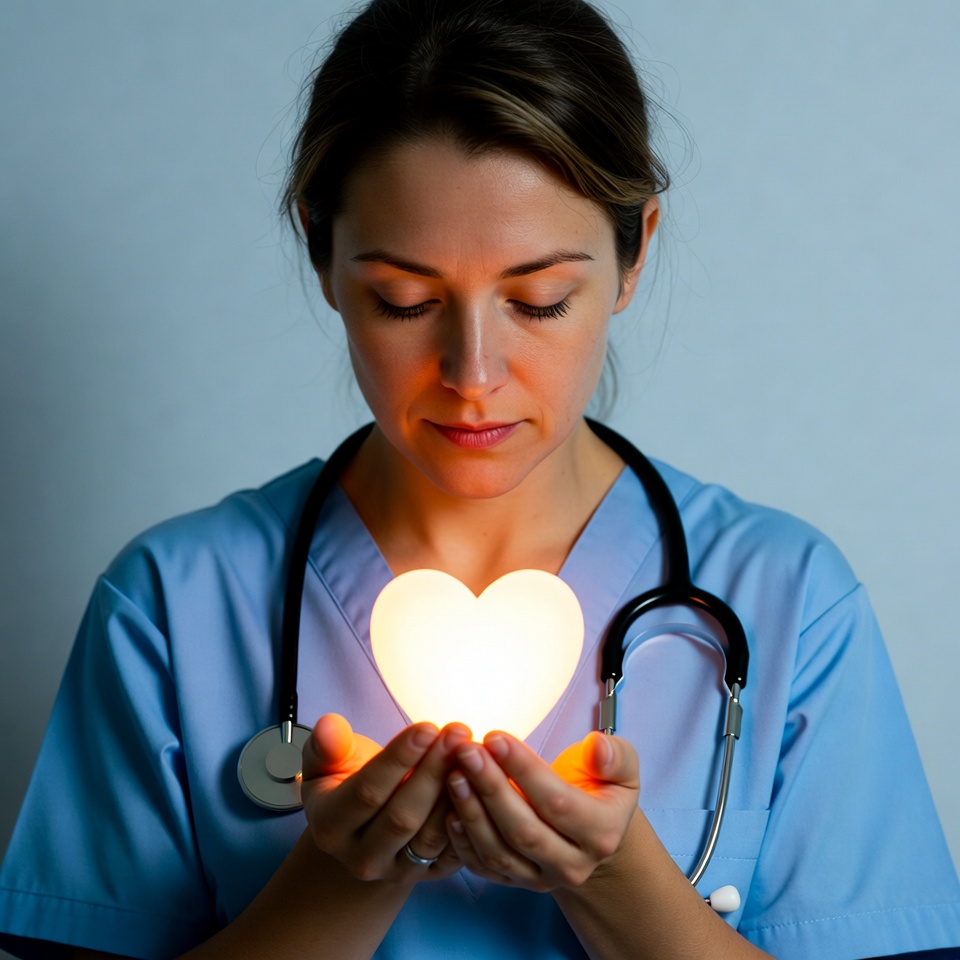 A woman in blue scrubs and stethoscope holds a glowing orange heart between her hands. She has brown hair tied back and gazes at the heart with a serene expression. The image features a plain blue background.