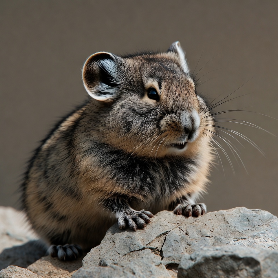 A fluffy chinchilla with gray and brown fur sits on a rock against a neutral background. It has large ears, round eyes, long whiskers, and paws positioned forward. The rodent appears alert with its mouth slightly open.