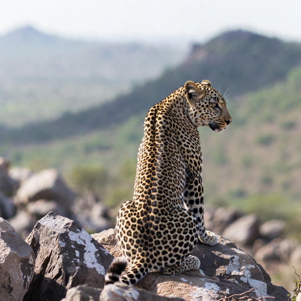 A leopard sits on a large rock overlooking a vast mountainous landscape. Its spotted coat gleams in the sunlight, with ears perked and tail curled behind. The background features hazy green hills and rocky terrain under a clear sky.