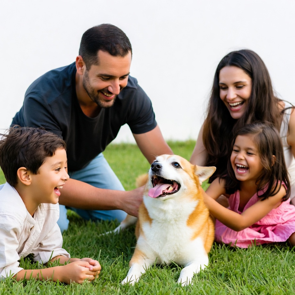 A smiling Latino family of two parents and two young children kneels and sits on green grass with their happy corgi dog. The father in a dark t-shirt and jeans pets the white and orange corgi, which lies on the ground with its tongue out. The mother in a light dress and the children in casual clothes laugh joyfully around the dog.