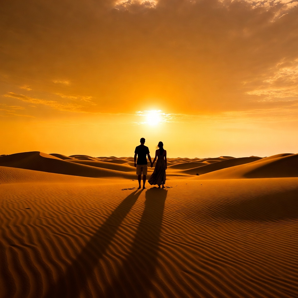 A man and woman stand back-to-back holding hands in a vast sandy desert at sunset. Their dark silhouettes contrast against the vibrant orange sky and rolling dunes with the sun low on the horizon. Long shadows extend from their figures across the golden sand.