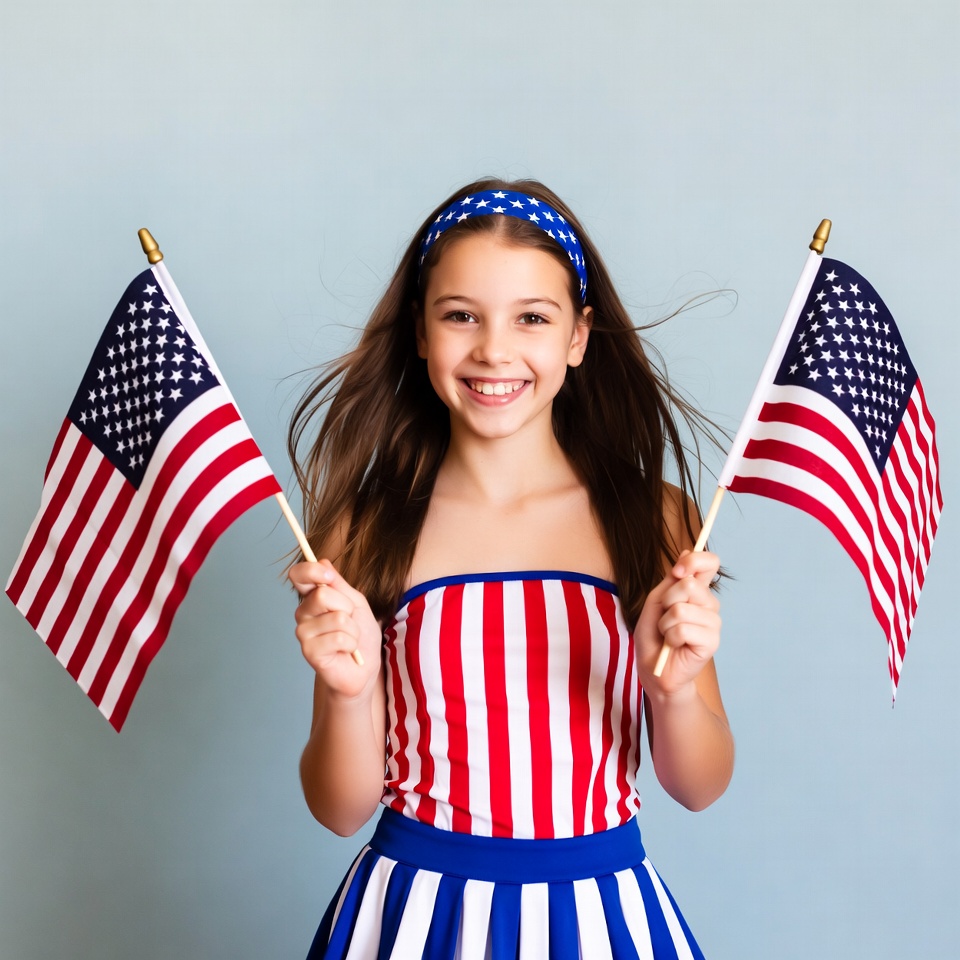 A young girl with long brown hair and a star headband smiles while holding two American flags. She wears a strapless red-white striped top and a blue-white striped skirt on a solid blue background. Her hair flows slightly as she poses happily.