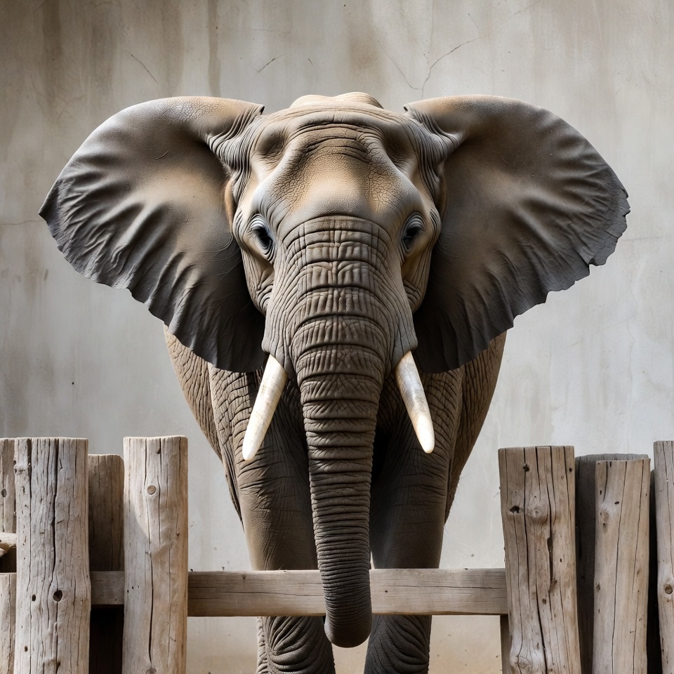 A large elephant with wide ears and long tusks stands behind a wooden fence, peering forward with its trunk extended. The elephant's textured gray skin and expressive eyes are prominently featured against a plain beige background. The fence consists of horizontal wooden logs in the foreground.